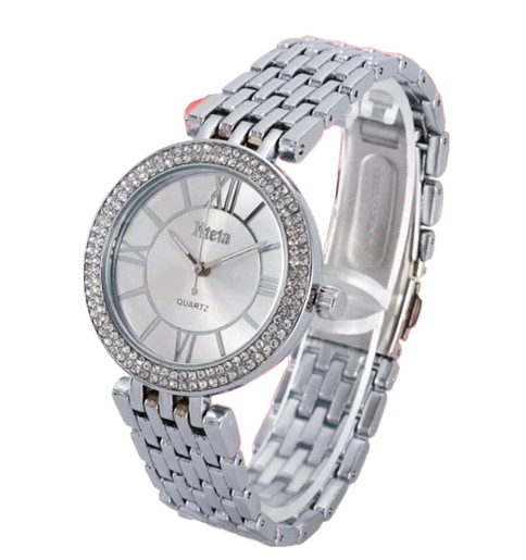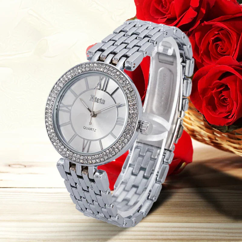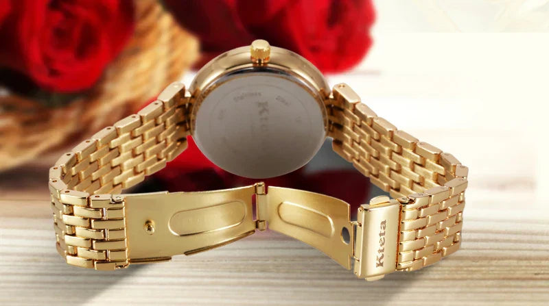 Desenhado especialmente para mulheres que valorizam sofisticação, esse relógio é uma verdadeira joia no seu pulso. Com acabamento em aço inoxidável banhado a ouro, incrustado com pedras brilhantes tipo diamante, ele combina o luxo de um acessório de alta classe com a funcionalidade e precisão do movimento Quartz Japonês.